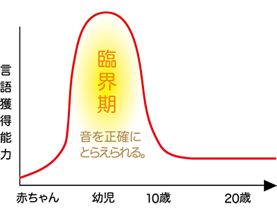 逆に言えば、この時期を逃してしまうと正しい「音」を認識することが非常に困難になるため、その後に英語を学習したとしても、幼児期に正しい英語の「音」を習得した子どもとは発音に大きな差がついてしまいます。