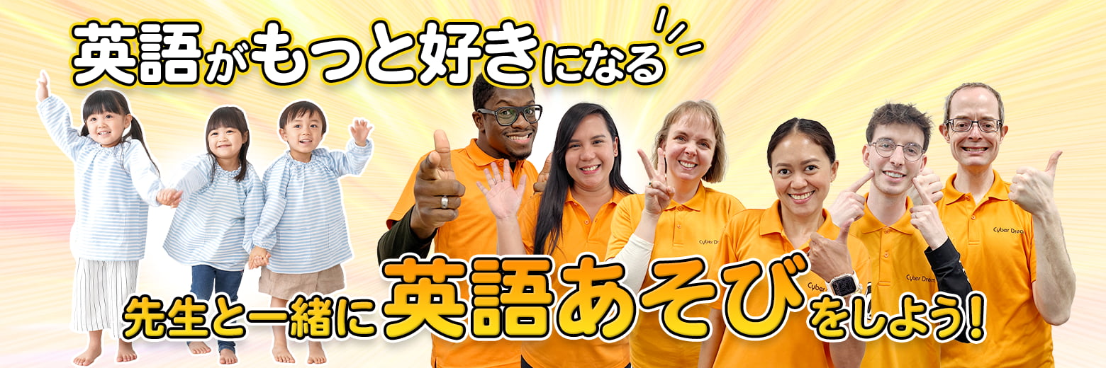 外国人講師1名とオールイングリッシュでレッスンを行います。サイバードリームやオリジナルワークシートを使って、毎月のテーマに沿って楽しく遊びながら自然にリアルな英語が身に付けることを目標としています。